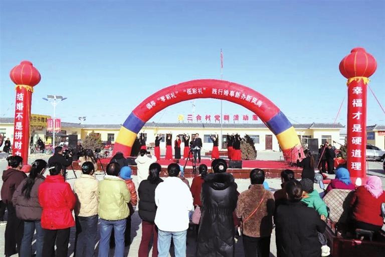 前幾天,蘇武鎮三合村村委會門前熱熱鬧鬧,高懸的彩柱上“結婚不是拼財力,幸福才是硬道理”的字眼格外醒目,一場倡導“零彩禮”“低彩禮”踐行婚事新辦新風尚的演出正在火熱進行。